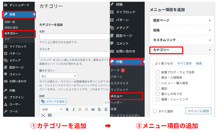 - 学び:WordPressでは「カテゴリー」と「メニュー」は別管理